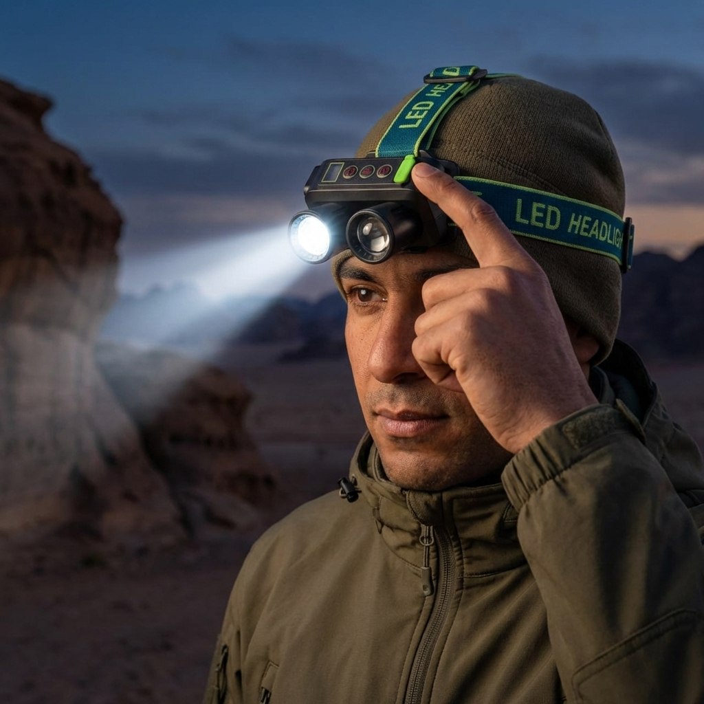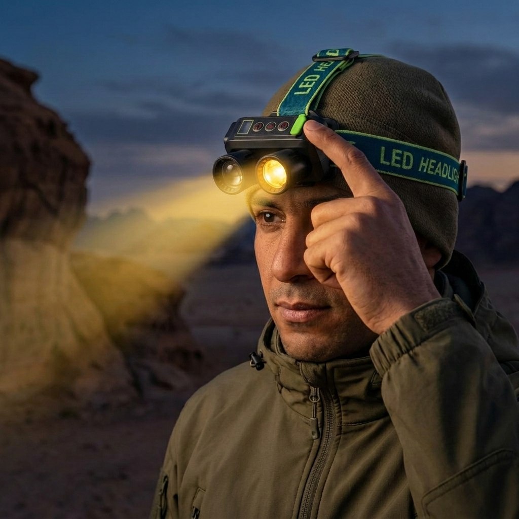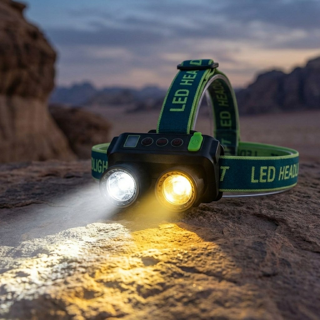 كشاف رأس ثنائي الإضاءة ،كشاف الرأس ده مناسب لأي حد بيحتاج إضاءة قوية وسهلة في نفس الوقت، خصوصًا في التخييم، الهايكنج، أو الشغل في أماكن ضلمة. بييجي بإضاءة مزدوجة: جانب أبيض للرؤية الواضحة، وجانب أصفر مريح للعين ومناسب في الأجواء الهادية أو الضباب.